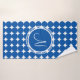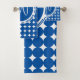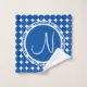 Blue dots in close quarters create a secondary pattern of white stars. A large blue circle is surrounded by white lines, while a single white initial graces the centre.