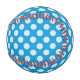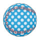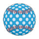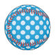 Fun, colourful baseball with white polka dots on blue design.