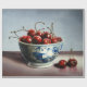 A classic blue-and-white porcelain bowl brims with glossy red cherries, each one painted with meticulous realism and soft natural light. The contrast between the cool ceramic and the rich, ripe fruit creates a sense of freshness, abundance, and timeless calm.