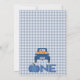 Cute boy's pumpkin truck first birthday invitation featuring navy blue harvest truck, blue pumpkin that spells out the word one, various blue and orange pumpkins, autumn leaves and blue plaid pattern. This design is a cute way to invite guests to an autumn or fall boy's pumpkin truck themed first birthday party with a navy blue and orange color scheme.