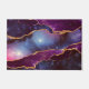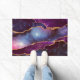 A door mat with an abstract design with blue and purple layers with faux gold foil ribbons in between.