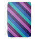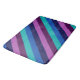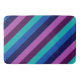 A large sized bath mat featuring a colourful pattern design of diagonal stripes in cool teal, ocean blue, navy blue, plum purple, and lavender.
