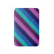 A small sized bath mat featuring a colourful pattern design of diagonal stripes in cool teal, ocean blue, navy blue, plum purple, and lavender.