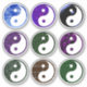 Set of nine yin yang symbols with various surface textures, including cloudsl bubbles, moss, brick and more. Colours include blue, purple, brown and green. Note that this is a printed product and is not actually shiny.  These fun cut out stickers are perfect for scrapbooking, journalling, gifts and decoration.