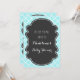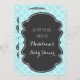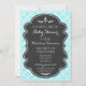 Personalised baby shower invitations in elegant and modern bright aqua sky blue, dark charcoal grey and white quatrefoil pattern with cute vintage chalkboard look. Customisable with your text, contact us to request a colour change.