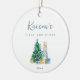 Blue Bunny Rabbit Baby's First Christmas Custom Name Round Ceramic Ornament — The precious personalised xmas ornament template features an adorable watercolor rabbit, standing beside a festive christmas tree with lovely wrapped gifts. The text boxes allow for easy customisation of any baby's name in a handwritten calligraphy script font, and birth year in a simple, minimalist sans serif. Both sides of this personalizable, gender neutral keepsake tree decoration are identical.