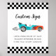 Race car theme boy's birthday party custom sign featuring a watercolor illustration of a blue vintage car with red flames. Create signs such as cards & gifts, snack bar, favours, guestbook, etc.