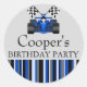 This modern customisable birthday sticker features a blue & Black Race Car on a grey background. Customise it by adding your details in the font of your choice!