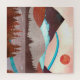 Mountain landscape scene in reds and blues with a lake and a bold blue rainbow.