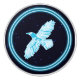 A simple, glowing, blue-and-white line image of a Raven (Corvus corax) on a starry background image.