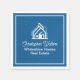 This professional realtor paper napkin is custom made with your real estate company name under the modern white cursive script for an open house. This elegant blue realty business party decor features a house logo image for home builder or realty agent company marketing.