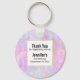 Party favour key chain with an abstract background pattern. Pink purple and blue watercolors make up this artistic design which features vertical rectangle shapes on a soft mottled background. A square layered over top with a faux gold foil border, your personalised text inside.