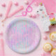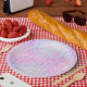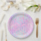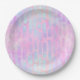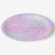 Paper plates with an abstract background pattern. Pink purple and blue watercolors make up this artistic design which features vertical rectangle shapes on a soft mottled background.