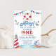 Cute nautical themed boy's 1st birthday invitation featuring a sail boat, lighthouse, anchors, buoy and bunting flags. This ahoy our little sailor it truing one first birthday invitation is ideal for a nautical themed first birthday party.
