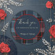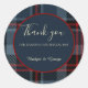 This wedding thank you sticker comes in different sizes, shapes and papers. It is customisable with your Intros, names and or monograms. It shows a harmonious blend of a navy blue red black scottish pattern and it has fitting light blue tones and white typography. The minimal round navy blue overlay with a burgundy border is for your customisation. Hobinishop