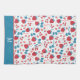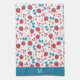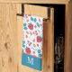 This pretty kitchen towel features a blue, red, pink, and white pattern of boho style strawberry and leaf images. At one end is a matching solid blue border that holds your monogram in white. Cute!