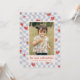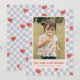 A festive Valentine's Day card with red hearts scattered over a bright blue chequerboard design. The message and customer information is placed beneath a large photo, and the back of the card features a coordinating pattern.