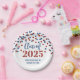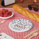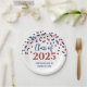 Customisable graduation party class of 2025 plates in glamourous red and blue confetti pattern and elegant hand lettered style text.