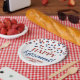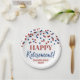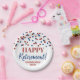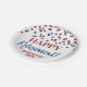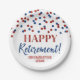 Custom happy retirement plates in dark blue and red confetti pattern.