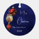 An navy blue uneven coloured background. Decorated with red and gold baubles. Personalise and add your name, year. Text: Merry Christmas