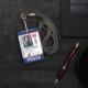Vertical press ID with red and blue as accent colours. Add photo, logo, name, title, ID number and more.