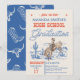 Blue and red rodeo or cowboy themed high school graduation invitation featuring a desert landscape, cowboy and horse, rope style and other western style font text.