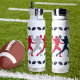 Blue,Red,&Silver Patriot Football Player figure Water Bottle! Fun whimsical American Football player silhouettes in blue, red, and silver Patriots colours adorn this water bottle. For the football fan who's teams colours are blue, red, and silver. A great gift for father's day, for him, or any special occasion.
