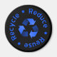 Black and blue reduce - reuse - recycle magnet with blue recycling symbol.