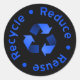 Reduce, reuse, recycle sticker in black with blue text and recycling symbol.