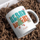 Retro groovy typography customisable script coffee mug. The design features the text "Merry Bright" in blue and brown groovy typography with kawai-themed elements like Christmas tree, colourful santa and stars. The name can be easily customised. Makes for the best personalised gift for yourself, your friends, family members and even neighbours. We have 45+ more Christmas designs in retro, watercolor and funny typography-based themes in our collection that you will definitely love. Merry Christmas!