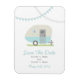 A save the date wedding magnet featuring an illustration of blue vintage trailer with a window box full of flowers. Blue and grey bunting at top. Look for matching items at Jill's Paperie.