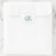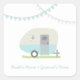 A wedding sticker featuring an illustration of a blue vintage trailer with window box of flowers. Blue and grey bunting at top. Personalise with names of bride and groom.
