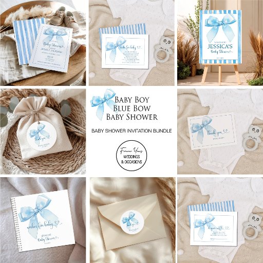 This charming baby shower invitation showcases a watercolor blue bow on the front and blue watercolor stripes on the back. You can personalise it with your information to create a unique invitation. Simply click the edit/personalise button to customise this design. This delightful invitation is part of a complete baby shower suite.