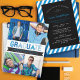 This is a double-sided design. The grad party invite details are on the back of the card on a plain black rectangle overlaying a simple striped pattern.