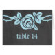 Sweet and pretty Rose Chalkboard Table Number Card in light blue featuring a single lovely rose on a vine on a chalkboard look background. This elegant design is perfect for a spring or summer wedding. Easy to customise, simply add the appropriate table number(s) in the text field provided. Click "Customise It" to find more personalisation options.