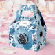 A beautiful illustration of large blue roses and small daisy style wild flowers surrounded by leaf sprigs set against a white background that has a scallop edge banner edged with blue and faux gold on it for your personalised wording. These are ideal for country wedding; spring day celebrations; bridal and baby shower parties.
