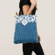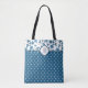 The bottom portion of this tote bag has a pretty blue and white polka dot pattern. At the top is a band with a blue rose print on a white background. The two sections are separated with thin darker blue strips and an ornate banner with your own monogram. The back of the bag has the same polka dot design with the floral band, but without the banner or monogram. Beautiful for spring and summer, and personalised for you!