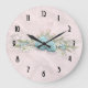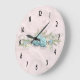 A clock with a photo of blue roses surrounded by sprigs and leaves and fancy baubles. The baubles also form a crown shape. White flowers and pretty blue bows and white lacy ribbon also surround the roses. Set on a dusty pink marble background.