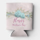 happy Mother's Day can cozie designed with a photo of blue roses surrounded by sprigs and leaves and fancy baubles. The baubles also form a crown shape. White flowers and pretty blue bows and white lacy ribbon also surround the roses. Set on a dusty pink marble background.