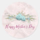 Happy Mother's Day stickers designed with a photo of blue roses surrounded by sprigs and leaves and fancy baubles. The baubles also form a crown shape. White flowers and pretty blue bows and white lacy ribbon also surround the roses. Set on a dusty pink marble background.