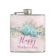 Happy Mother's Day flask designed with a photo of blue roses surrounded by sprigs and leaves and fancy baubles. The baubles also form a crown shape. White flowers and pretty blue bows and white lacy ribbon also surround the roses. Set on a dusty pink marble background.