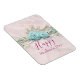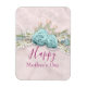 A happy Mother's Day flex magnet designed with a photo of blue roses surrounded by sprigs and leaves and fancy baubles. The baubles also form a crown shape. White flowers and pretty blue bows and white lacy ribbon also surround the roses. Set on a dusty pink marble background.