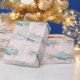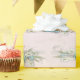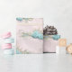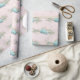 Wrapping paper with a repeating pattern of a photo of blue roses surrounded by sprigs and leaves and fancy baubles. The baubles also form a crown shape. White flowers and pretty blue bows and white lacy ribbon also surround the roses. Set on a dusty pink marble background.