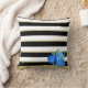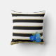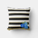 Blue Roses on Black, White, Gold Stripes Cushion