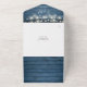 All in one wedding invitation featuring pretty string lights, mason jars, signature style names and chic typography on a blue rustic wood background. The invitation includes a perforated RSVP card with your wedding website QR code. Designed by Thisisnotme©