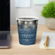 Elegant rustic wedding paper cup personalised with signature style names and your special wedding date on a string lights and blue wood panels background. Designed by Thisisnotme©