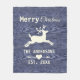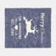 Personalised Christmas decor is a great way to celebrate the holiday season to decorate your home or give as a gift. This blanket design features a blue rustic weathered wood background with a graceful flying reindeer in cream with the words "Merry Christmas" above the deer. Below is your family name to personalise, a decorative arrow with heart, and the year your family was established. Designed by artist © Susan Coffey.