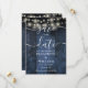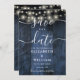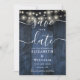 This elegant blue rustic barn wood string lights boho wedding save-the-date card can be personalised with your information in chic typography. Designed by Thisisnotme©