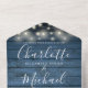 All in one wedding invitation with pretty string lights, signature style names and chic typography on a blue rustic wood background. The invitation includes a perforated RSVP card with your wedding website QR code and Details. Designed by Thisisnotme©