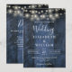 This blue rustic barn wood string lights wedding invitation can be personalised with your information in modern typography and a wedding website QR code on the reverse. Designed by Thisisnotme©